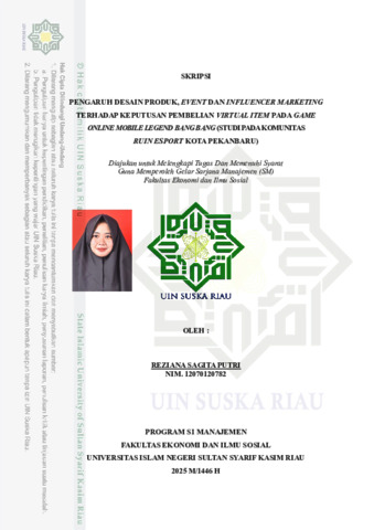 REZIANA SAGITA PUTRI, - (2025) PENGARUH DESAIN PRODUK, EVENT DAN INFLUENCER MARKETING TERHADAP KEPUTUSAN PEMBELIAN VIRTUAL ITEM PADA GAME ONLINE MOBILE LEGEND BANG BANG (STUDI PADA KOMUNITAS RUIN ESPORT KOTA PEKANBARU). Skripsi thesis, Universitas Islam Negeri Sultan Syarif Kasim Riau.