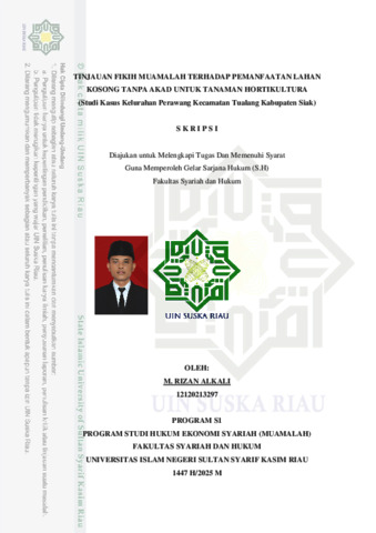 M. RIZAN ALKALI, - (2025) TINJAUAN FIKIH MUAMALAH TERHADAP PEMANFAATAN LAHAN KOSONG TANPA AKAD UNTUK TANAMAN HORTIKULTURA (Studi Kasus Kelurahan Perawang Kecamatan Tualang Kabupaten Siak). Skripsi thesis, Universitas Islam Negeri Sultan Syarif Kasim Riau.