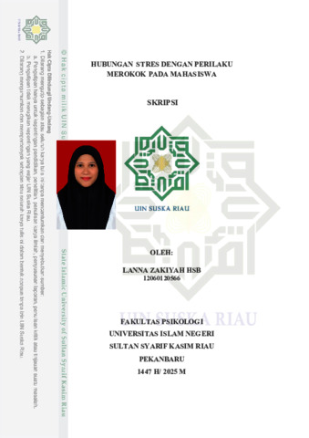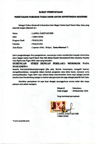 LANNA ZAKIYAH HSB, - (2025) HUBUNGAN STRES DENGAN PERILAKU MEROKOK PADA MAHASISWA. Skripsi thesis, Universitas Islam Negeri Sultan Syarif Kasim Riau.