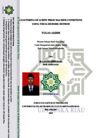 M. TAUFIK APRINALDO, - (2025) CLUSTERING OF SREW PRESS MACHINE CONDITIONS USING THE K-MEDOIDS METHOD. ENGINEERING AND TECHNOLOGY JOURNAL, 10 (11). pp. 7916-7922. ISSN ISSN: 2456-3358