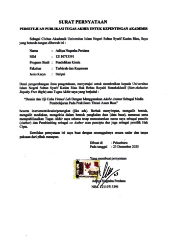 ADITYA NUGRAHA PERDANA, - (2025) DESAIN DAN UJI COBA VIRTUAL LAB DENGAN MENGGUNAKAN ADOBE ANIMET SEBAGAI MEDIA PEMBELAJARAN PADA PRAKTIKUM TITRASI ASAM BASA. Skripsi thesis, Universitas Islam Negeri Sultan Syarif Kasim Riau.