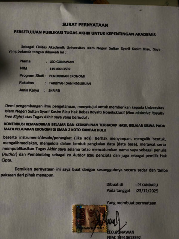 LEO GUNAWAN, - (2025) KONTRIBUSI KEMANDIRIAN BELAJAR DAN KEDISIPLINAN TERHADAP HASIL BELAJAR SISWA PADA MATA PELAJARAN EKONOMI DI SMAN 2 KOTO KAMPAR HULU. Skripsi thesis, UNIVERSITAS ISLAM NEGERI SULTAN SYARIF KASIM RIAU.