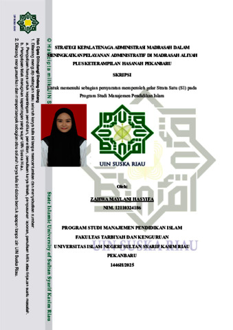 ABSTRAK Zahwa Maylani Hasyifa, (2025): Strategi Kepala Tenaga Administrasi Madrasah dalam Meningkatkan Pelayanan Administratif di Madrasah Aliyah Plus Keterampilan Hasanah Pekanbaru Penelitian ini berjudul "Strategi Kepala Tenaga Administrasi Madrasah dalam Meningkatkan Pelayanan Administratif di Madrasah Aliyah Plus Keterampilan Hasanah Pekanbaru". Penelitian ini menggunakan pendekatan kualitatif dengan jenis penelitian deskriptif. Teknik pengumpulan data dilakukan melalui wawancara, observasi, dan dokumentasi. Informan utama dalam penelitian ini adalah Kepala Tenaga Administrasi dan Staf Tata Usaha, sedangkan informan tambahan meliputi Kepala Madrasah, guru, dan siswa. Data dianalisis menggunakan model Miles dan Huberman yang terdiri dari reduksi data, penyajian data, dan penarikan kesimpulan. Hasil penelitian menunjukkan bahwa strategi kepala tenaga administrasi dalam meningkatkan pelayanan administratif dilakukan melalui beberapa langkah yaitu perencanaan kerja administrasi, pengorganisasian tugas staf, pelaksanaan pelayanan secara efektif dan terstruktur, pengawasan dan evaluasi rutin, serta pengembangan kompetensi staf melalui pemanfaatan teknologi dan peningkatan kedisiplinan pelayanan. Kata Kunci: Strategi, Kepala Tenaga Administrasi, Pelayanan Administratif, Madrasah