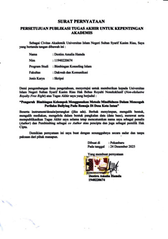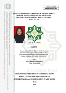 DESTIRA AMALIA HAMDA, - (2025) PENGARUH BIMBINGAN KELOMPOK MENGGUNAKAN METODE MINDFULNESS DALAMMENCEGAH PERILAKU BULLYING PADA REMAJA DI DESA KOTA INTAN. Skripsi thesis, UNIVERSITAS ISLAM NEGRI SULTAN SYARIF KASIM RIAU.
