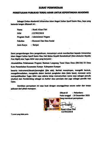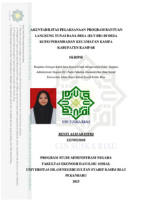 RENTI ALIZAR FITRI, - (2026) AKUNTABILITAS PELAKSANAAN PROGRAM BANTUAN LANGSUNG TUNAI DANA DESA (BLT-DD) DI DESA KOTO PERAMBAHAN KECAMATAN KAMPA KABUPATEN KAMPAR. Skripsi thesis, UNIVERSITAS ISLAM NEGERI SULTAN SYARIF KASIM RIAU.