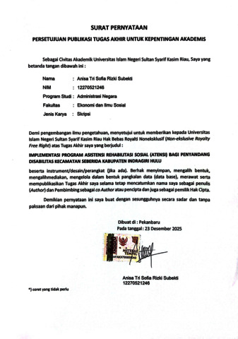 ANISA TRI SOFIA RIZKI SUBEKTI, - (2026) IMPLEMENTASI PROGRAM ASISTENSI REHABILITASI SOSIAL (ATENSI) BAGI PENYANDANG DISABILITAS KECAMATAN SEBERIDA KABUPATEN INDRAGIRI HULU. Skripsi thesis, UNIVERSITAS ISLAM NEGERI SULTAN SYARIF KASIM RIAU.