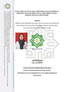 LIONNY FIOLA, - (2026) INOVASI PELAYANAN KADO CAMER (KERJASAMA PENERBITAN DOKUMEN AKTA KELAHIRAN PASCA MELAHIRKAN) PADA DISDUKCAPIL KOTA PEKANBARU. Skripsi thesis, UNIVERSITAS ISLAM NEGERI SULTAN SYARIF KASIM RIAU.