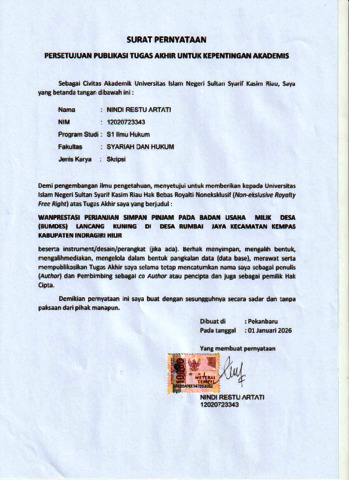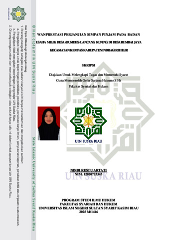 NINDI RESTU ARTATI, - (2026) WANPRESTASI PERJANJIAN SIMPAN PINJAM PADA BADAN USAHA MILIK DESA (BUMDES) LANCANG KUNING DI DESA RUMBAI JAYA KECAMATAN KEMPAS KABUPATEN INDRAGIRI HILIR. Skripsi thesis, UNIVERSITAS ISLAM NEGRI SULTAN SYARIF KASIM RIAU.