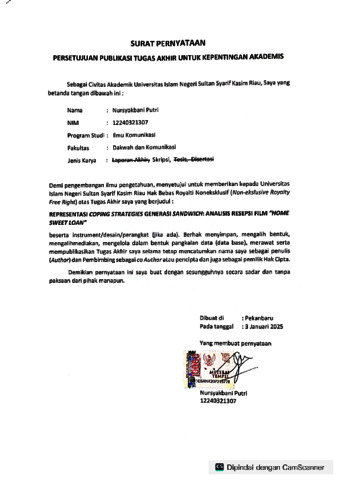 NURSYAKBANI PUTRI, - (2026) REPRESENTASI COPING STRATEGIES GENERASI SANDWICH: ANALISIS RESEPSI FILM "HOME SWEET LOAN". Skripsi thesis, UNIVERSITAS ISLAM NEGERI SULTAN SYARIF KASIM RIAU.