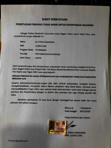 M. FITRAH RAMADHAN, - (2026) ANALISIS PENDAPATAN USAHA PETERNAKAN SAPI BALI DI KECAMATAN TEMBILAHAN KABUPATEN INDRAGIRI HILIR. Skripsi thesis, UNIVERSITAS ISLAM NEGERI SULTAN SYARIF KASIM RIAU.