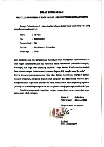 IRA PUTRI, - (2026) DAYA TERIMA KESUKAAN DAN ANALISIS SERAT COOKIES DENGAN PENAMBAHAN PERSENTASE TEPUNG BIJI NANGKA YANG BERBEDA. Skripsi thesis, UNIVERSITAS ISLAM NEGERI SULTAN SYARIF KASIM RIAU.