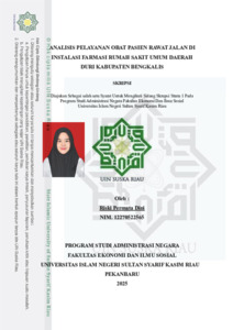 ABSTRAK ANALISIS PELAYANAN OBAT PASIEN RAWAT JALAN DI INSTALASI FARMASI RUMAH SAKIT UMUM DAERAH DURI KABUPATEN BENGKALIS Oleh : RISKI PERMATA DINI 12270522565 Rumah Sakit Umum Daerah Duri Kabupaten Bengkalis merupakan salah satu instansi pelayanan kesehatan yang berupaya memberikan pelayanan terbaik kepada masyarakat, salah satunya melalui pelayanan obat bagi pasien rawat jalan di Instalasi Farmasi. Tujuan penelitian ini adalah untuk mengetahui pelayanan obat pasien rawat jalan di Instalasi Farmasi RSUD Duri Kabupaten Bengkalis, serta untuk mengetahui faktor-faktor penghambat dalam pelayanan tersebut. Penelitian ini menggunakan teori pelayanan publik menurut Sinambela secara teoritis, tujuan pelayanan publik pada dasarnya adalah memuaskan masyarakat. Metode penelitian yang digunakan adalah deskriptif kualitatif dengan teknik pengumpulan data melalui observasi, wawancara, dan dokumentasi. Teknik Analisa data dalam penelitian ini dilakukan melalui pengumpulan data, reduksi data, penyajian data, dan penarikan kesimpulan. Hasil penelitian menunjukkan bahwa pelayanan obat pasien rawat jalan di Instalasi Farmasi RSUD Duri Kabupaten Bengkalis belum berjalan optimal. Terlihat dari beberapa indikator yaitu indikator transparansi, akuntabilitas, kondisional, partisipatif, kesamaan hak, keseimbangan, dan kewajiban. Adapun faktor penghambatnya ialah (1) Keterbatasan Sumber Daya Manusia (SDM) Farmasi (2) Keterbatasan Sarana dan Prasarana Pendukung di Instalasi Farmasi (3) Keterbatasan ketersediaan obat (4) Kurangnya Keterbukaan dan Komunikasi Informasi kepada Pasien (5) Kurangnya optimalisasi program SIMPONI Kata Kunci : Pelayanan Obat, Instalasi Farmasi, Pasien Rawat Jalan