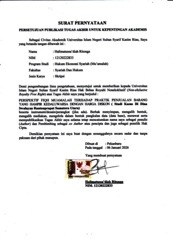 ABSTRAK Halimatussa’diah Ritonga, (2025): Perspektif Fiqh Muamalah terhadap Praktik Penjualan Barang yang Hampir Kedaluwarsa dengan Harga Diskon Studi Kasus di Dina Swalayan Rantauprapat Sumatera Utara Penelitian ini dilatarbelakangi oleh praktik penjualan barang yang mendekati masa kedaluwarsa dengan harga diskon yang marak dilakukan di berbagai swalayan, termasuk Dina Swalayan Rantauprapat. Praktik tersebut menarik minat konsumen karena harga yang lebih murah, namun disisi lain menimbulkan persoalan hukum dan etika, khususnya terkait kejujuran, keterbukaan informasi, perlindungan konsumen, serta keabsaan akad jual beli dalam perspektif fiqh muamalah. Kurangnya penjelasan yang memadai mengenai kondisi dan sisa masa kedaluwarsa barang berpotensi merugikan konsumen dan bertentangan dengan prinsip muamalah Islam. Berdasarkan hal tersebut, tujuan penelitian ini adalah yang pertama untuk mengetahui bentuk perlindungan konsumen terhadap praktik penjualan barang promo yang mendekati masa kedaluwarsa di Dina Swalayan Rantauprapat Sumatera Utara, dan kedua untuk menganalisis praktik tersebut ditinjau dari perspektif Fiqh Muamalah . Metode penelitian yang digunakan adalah penelitian lapangan (field research) dengan pendekatan kualitatif deskriptif. Data di peroleh memalui observasi, wawancara, dan dokumentasi terhadap pemilik swalayan, karyawan, serta konsumen. Data yang terkumpul dianalisis dengan teknik reduksi data, penyajian data,dan penarikan kesimpulan, guna memperoleh gambaran yang komprehensif mengenai praktik penjualan barang mendekati masa kedaluwarsa serta tinjauannya menurut fiqh muamalah dan perlindungan konsumen. Hasil penelitian menunjukkan bahwa yang pertama perlindungan konsumen dalam praktik penjualan barang mendekati masa kedaluwarsa di Dina Swalayan belum dilaksanakan secara optimal, terutama dalam aspek transparansi informasi mengenai kondisi dan sisa masa kedaluwarsa produk. Kedua, ditinjau dari Fiqh Muamalah, praktik jual beli tersebut secara hukum akad dinilai sah selama barang masih halal dan belum melewati masa kedaluwarsa, namun secara etika belum sepenuhnya sesuai dengan prinsip kejujuran (sidq), keterbukaan (bayan), dan kemaslahatan (maslahah), serta berpotensi mengandungunsur gharar dan tadlis apabila informasi tidak disampaikan secara jelas kepada konsumen Kata Kunci: Fiqh Muamalah, Diskon, Barang Mendekati Kedaluwarsa, Etika Bisnis Islam, Perlindungan Konsumen.