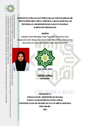 SAHARA NABILA, - (2026) EFEKTIVITAS PELAYANAN PERUSAHAAN UMUM DAERAH AIR MINUM (PERUMDA) TIRTA TERUBUK CABANG DURI DALAM PENYEDIAAN AIR BERSIH DI KECAMATAN MANDAU, KABUPATEN BENGKALIS. Skripsi thesis, UNIVERSITAS ISLAM NEGERI SULTAN SYARIF KASIM RIAU.
