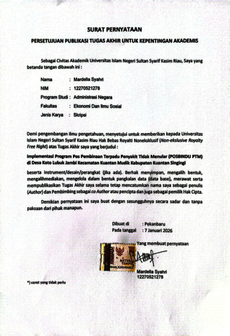 MARDELLA SYAHRI, - (2026) IMPLEMENTASI PROGRAM POS PEMBINAAN TERPADU PENYAKIT TIDAK MENULAR (POSBINDU PTM) DI DESA KOTO LUBUK JAMBI KECAMATAN KUANTAN MUDIK KABUPATEN KUANTAN SINGINGI. Skripsi thesis, UNIVERSITAS ISLAM NEGERI SULTAN SYARIF KASIM RIAU.