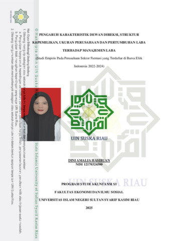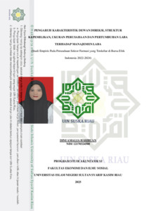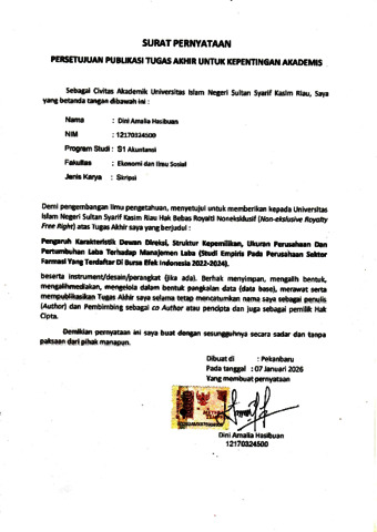 DINI AMALIA HASIBUAN, - (2026) PENGARUH KARAKTERISTIK DEWAN DIREKSI, STRUKTUR KEPEMILIKAN, UKURAN PERUSAHAAN DAN PERTUMBUHAN LABA TERHADAP MANAJEMEN LABA (Studi Empiris Pada Perusahaan Sektor Farmasi yang Terdaftar di Bursa Efek Indonesia 2022-2024). Skripsi thesis, UNIVERSITAS ISLAM NEGERI SULTAN SYARIF KASIM RIAU.