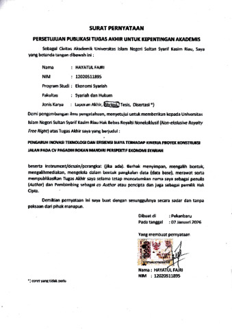 HAYATUL FAJRI, - (2026) PENGARUH INOVASI TEKNOLOGI DAN EFISIENSI BIAYA TERHADAP KINERJA PROYEK KONSTRUKSI JALAN PADA CV PAGADIH ROKAN MANDIRI PERSPEKTIF EKONOMI SYARIAH. Skripsi thesis, UNIVERSITAS ISLAM NEGERI SULTAN SYARIF KASIM RIAU.