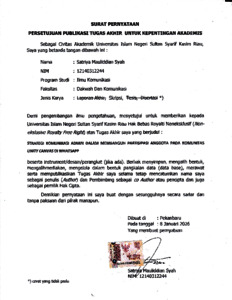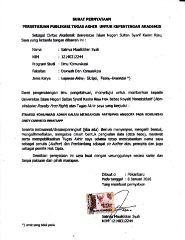 SATRIYA MAULIDDIAN SYAH, - (2025) STRATEGI KOMUNIKASI ADMIN DALAM MEMBANGUN PARTISIPASI ANGGOTA PADA KOMUNITAS UNITY CANVAS DI WHATSAPP. Skripsi thesis, Universitas Islam Negeri Sultan Syarif Kasim Riau.