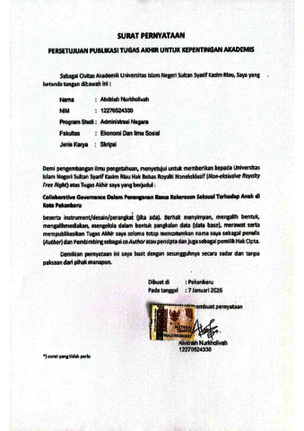 ALVITRIAH NURKHOLIVAH, - (2025) COLLABORATIVE GOVERNANCE DALAM PENANGANAN KASUS KEKERASAN SEKSUAL TERHADAP ANAK DI KOTA PEKANBARU. Skripsi thesis, Universitas Islam Negeri Sultan Syarif Kasim Riau.