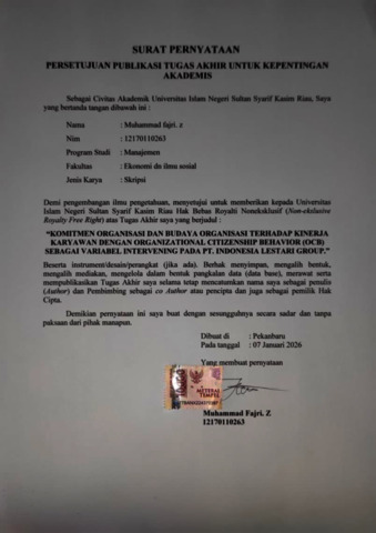 MUHAMMAD FAJRI. Z, - (2026) PENGARUH KOMITMEN ORGANISASI DAN BUDAYA ORGANISASI TERHADAP KINERJA KARYAWAN DENGAN ORGANIZATIONAL CITIZENSHIP BEHAVIOR (OCB) SEBAGAI VARIABEL INTERVENING PADA PT. INDONESIA LESTARI GROUP. Skripsi thesis, UNIVERSITAS ISLAM NEGERI SULTAN SYARIF KASIM RIAU.