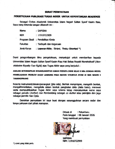 SAFRINA, - (2026) ANALISIS KETERAMPILAN BERARGUMENTASI ILMIAH PESERTA DIDIK KELAS X MIA DENGAN MODEL PEMBELAJARAN PROBLEM BASED LEARNING PADA MATERI STRUKTUR ATOM DI SMA NEGERI 3 TANJUNGPINANG. Skripsi thesis, UNIVERSITAS ISLAM NEGERI SULTAN SYARIF KASIM RIAU.