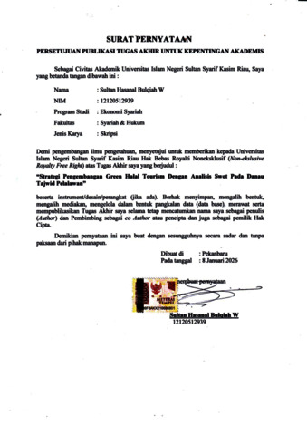 SULTAN HASANAL BULQIAH W, - (2025) STRATEGI PENGEMBANGAN GREEN HALAL TOURISM DENGAN ANALISIS SWOT PADA DANAU TAJWID PELALAWAN. Skripsi thesis, Universitas Islam Negeri Sultan Syarif Kasim Riau.