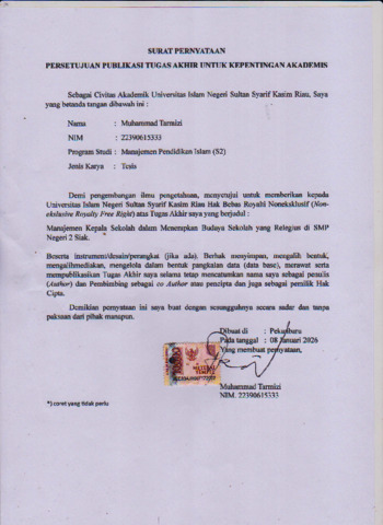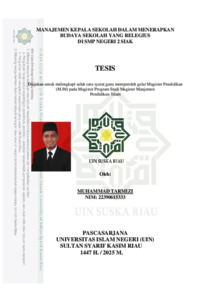 ABSTRAK Muhammad Tarmizi: Manajemen Kepala Sekolah dalam Menerapkan Budaya Sekolah yang Religius di SMP Negeri 2 Siak Penelitian ini bertujuan untuk mendeskripsikan secara mendalam manajemen kepala sekolah dalam menerapkan budaya sekolah yang religius di SMP Negeri 2 Siak. Manajemen kepala sekolah dipahami sebagai proses menggerakkan sumber daya manusia dan non-manusia melalui fungsi perencanaan, pengorganisasian, pelaksanaan, dan pengawasan agar tujuan pendidikan tercapai secara efektif dan efisien. Budaya religius di sekolah tidak hanya berkaitan dengan rutinitas keagamaan, tetapi juga menjadi fondasi pembentukan karakter, akhlak, dan kepribadian peserta didik melalui pembiasaan serta keteladanan. Penelitian ini menggunakan pendekatan kualitatif dengan pengumpulan data melalui observasi, wawancara mendalam, dan dokumentasi. Fokus kajian diarahkan pada strategi kepala sekolah dalam merancang program religius, implementasi kegiatan di lingkungan sekolah, serta bentuk evaluasi yang dilakukan. Hasil penelitian menunjukkan bahwa manajemen dilaksanakan melalui penyusunan program jangka pendek dan jangka panjang yang diintegrasikan ke dalam kalender akademik sekolah. Pelaksanaan budaya religius diwujudkan melalui pembiasaan kegiatan karakter 5S (Senyum, Sapa, Salam, Sopan, Santun), shalat zuhur berjamaah, shalat dhuha, berinfaq, muhadharah, peringatan hari besar Islam, serta penguatan keteladanan guru. Dukungan internal seperti komitmen pendidik dan antusiasme siswa menjadi faktor pendorong utama, sedangkan hambatan muncul dalam aspek kedisiplinan serta keterbatasan sarana. Evaluasi dilakukan melalui pengamatan sikap dan perilaku siswa, dengan reward dan sanksi sebagai penguat pembiasaan. Temuan ini menunjukkan bahwa kepemimpinan kepala sekolah berperan sentral dalam menggerakkan budaya religius hingga menjadi identitas khas SMP Negeri 2 Siak. Kata Kunci: Manajemen, Kepala Sekolah, Budaya Religius