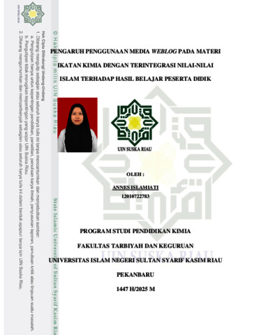 ANNES ISLAMIATI (2026) PENGARUH PENGGUNAAN MEDIA WEBLOG PADA MATERI IKATAN KIMIA DENGAN TERINTEGRASI NILAI-NILAI ISLAM TERHADAP HASIL BELAJAR PESERTA DIDIK. Skripsi thesis, Universitas Islam Negeri Sultan Syarif Kasim.