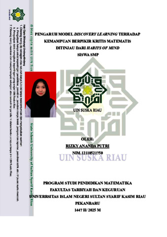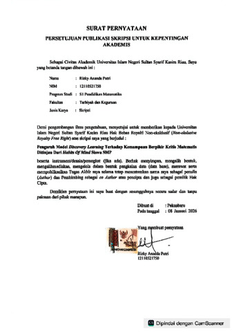 ABSTRAK Rizky Ananda Putri (2025): Pengaruh Model Discovery Learning terhadap Kemampuan Berpikir Kritis Matematis Ditinjau Dari Habits Of Mind Siswa SMP Penelitian ini bertujuan untuk menganalisis apakah model discovery learning berpengaruh terhadap kemampuan berpikir kritis matematis siswa, ditinjau dari aspek habits of mind. Metode yang dipakai dalam penelitian ini yaitu eksperimen, dengan desain penelitian berupa factorial experimental design. Penelitian diselenggarakan di SMP Negeri 5 Bathin Solapan pada semester ganjil tahun ajaran 2025/2026. Pemilihan sampel dilakukan menggunakan teknik cluster random sampling, sehingga kelas VII.A ditetapkan sebagai kelas eksperimen, sedangkan kelas VII.D sebagai kelas kontrol. Metode pengumpulan data mencangkup tes, angket, dan observasi. Instrumen yang digunakan meliputi soal tes kemampuan berpikir kritis matematis, angket habits of mind, serta lembar observasi. Berdasarkan hasil penelitian dengan menggunakan uji ANOVA dua arah, dapat disimpulkan 1) Terdapat ketidaksamaan kemampuan berpikir kritis matematis antara siswa yang belajar dengan model discovery learning dan mereka yang mendapatkan pembelajaran konvensional. 2) Kemampuan berpikir kritis matematis berbeda pada siswa dengan tingkat habits of mind tinggi, sedang dan rendah. 3) Tidak ditemukan interaksi antara model pembelajarandan habits of mind terhadap kemampuan berpikir kritis matematis.Berdasarkan hal tersebut, menurut keseluruhan diambil suatu kesimpulan bahwa model discovery learning memiliki pengaruh terhadap kemampuan berpikir kritis matematis ditinjau dari habits of mind siswa di SMP Negeri 5 Bathin Solapan. Kata kunci : Berpikir Kritis, Discovery Learning, Habits of Mind