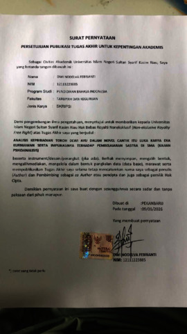 DWI NODELVA FEBRIANTI (2025) ANALISIS KEPRIBADIAN TOKOH DEWI AYU DALAM NOVEL CANTIK ITU LUKA KARYA EKA KURNIAWAN SERTA IMPLIKASINYA TERHADAP PEMBELAJARAN SASTRA DI SMA (KAJIAN PSIKOANALISIS). Skripsi thesis, UNIVERSITAS ISLAM NEGERI SULTAN SYARIF KASIM RIAU.