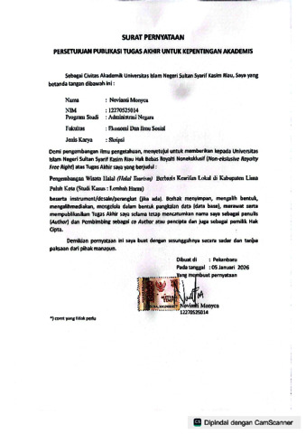 NOVIANTI MONYCA, - (2026) PENGEMBANGAN WISATA HALAL (HALAL TOURISM) BERBASIS KEARIFAN LOKAL DI KABUPATEN LIMA PULUH KOTA (Studi Kasus : Lembah Harau). Skripsi thesis, UNIVERSITAS ISLAM NEGERI SULTAN SYARIF KASIM RIAU.