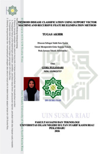 CITRA WULANDARI, - (2026) THYROID DISEASE CLASSIFICATION USING SUPPORT VECTOR MACHINE AND RECURSIVE FEATURE ELIMINATION METHOD. Bit-Tech (Binary Digital - Technology), 8 (2). pp. 2948-2960. ISSN Print ISSN 2622-271X Online ISSN 2622-2728