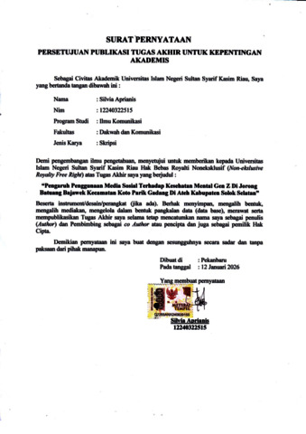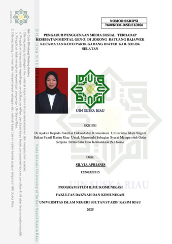 SILVIA APRIANIS, - (2026) PENGARUH PENGGUNAAN MEDIA SOSIAL TERHADAP KESEHATAN MENTAL GEN-Z DI JORONG BATUANG BAJAWEK KECAMATAN KOTO PARIK GADANG DIATEH KAB. SOLOK SELATAN. Skripsi thesis, UNIVERSITAS ISLAM NEGERI SULTAN SYARIF KASIM RIAU.