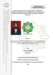ABSTRAK Nama : Silvia APrianis Jurusan : Ilmu Komunikasi Judul : Pengaruh Penggunaan Media Sosial Terhadap Kesehatan Mental Gen- Z Di Jorong Batuang Bajawek Kecamatan Koto Parik Gadang Diateh Kab. Solok Selatan Perkembangan teknologi digital menjadikan media sosial semakin melekat dalam kehidupan sehari-hari, khususnya pada Generasi Z. Media sosial tidak hanya berfungsi sebagai sarana komunikasi dan pertukaran informasi, tetapi juga memiliki dampak terhadap kondisi kesehatan mental penggunanya. Penelitian ini bertujuan untuk mengetahui hubungan dan pengaruh penggunaan media sosial terhadap kesehatan mental Generasi Z di Jorong Batuang Bajawek. Penelitian ini menggunakan pendekatan kuantitatif dengan desain survei. Populasi penelitian berjumlah 132 orang Generasi Z, dengan sampel sebanyak 120 responden yang dipilih berdasarkan kriteria aktif menggunakan media sosial. Variabel independen dalam penelitian ini adalah penggunaan media sosial, sedangkan variabel dependen adalah kesehatan mental. Analisis data dilakukan menggunakan uji korelasi Spearman, uji regresi linear sederhana, dan uji koefisien determinasi. Hasil uji korelasi Spearman menunjukkan nilai signifikansi 0,00 (< 0,05) dengan koefisien korelasi sebesar 0,860 yang menunjukkan hubungan kuat dan positif. Uji regresi linear sederhana menunjukkan nilai signifikansi 0,000 (< 0,05), yang berarti penggunaan media sosial berpengaruh signifikan terhadap kesehatan mental Generasi Z. Nilai koefisien determinasi (R Square) sebesar 0,707 menunjukkan bahwa 70,7% kondisi kesehatan mental dipengaruhi oleh penggunaan media sosial, sedangkan 29,3% dipengaruhi oleh faktor lain di luar penelitian. Berdasarkan hasil tersebut, dapat disimpulkan bahwa penggunaan media sosial memiliki hubungan dan pengaruh yang kuat serta signifikan terhadap kesehatan mental Generasi Z di Jorong Batuang Bajawek Kata kunci: Media sosial, kesehatan mental, Generasi Z, Jorong Batuang Bajawek.