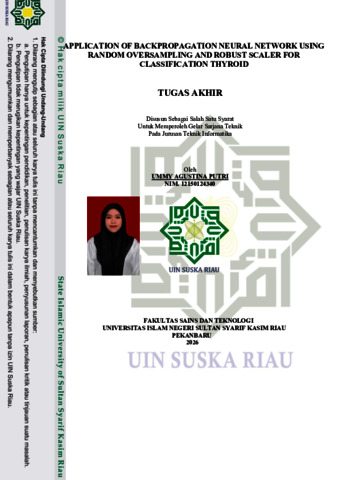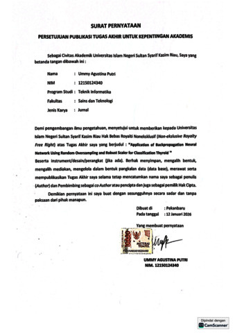 UMMY AGUSTINA PUTRI, - (2026) APPLICATION OF BACKPROPAGATION NEURAL NETWORK USING RANDOM OVERSAMPLING AND ROBUST SCALER FOR CLASSIFICATION THYROID. Bit-Tech (Binary Digital - Technology), 8 (2). pp. 2961-2973. ISSN Print ISSN 2622-271X Online ISSN 2622-2728