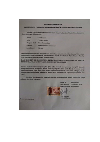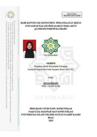 "ABSTRAK Nama : Evi Suryani Prodi : Ilmu Komunikasi Judul : Dari Konten Ke Konsumen: Pemanfaatan Reels Instagram Dalam Pemasaran Pada Akun @Limisostorepekanbaru Perkembangan teknologi digital dan media sosial telah mendorong perubahan strategi pemasaran, khususnya dalam pemanfaatan konten visual sebagai sarana komunikasi dengan konsumen. Instagram, melalui fitur Reels, menjadi salah satu platform yang banyak dimanfaatkan oleh pelaku usaha dalam kegiatan pemasaran digital. Penelitian ini bertujuan untuk mengetahui pemanfaatan Reels Instagram dalam pemasaran pada akun @limisostorepekanbaru sebagai salah satu usaha thrift fashion di Kota Pekanbaru. Penelitian ini menggunakan pendekatan kualitatif dengan metode deskriptif. Teknik pengumpulan data dilakukan melalui observasi, wawancara, dan dokumentasi terhadap pengelola akun Instagram serta konsumen Limiso Store Pekanbaru. Hasil penelitian menunjukkan bahwa pemanfaatan Reels Instagram oleh akun @limisostorepekanbaru dilakukan melalui penyajian konten yang informatif, menarik, dan konsisten, seperti menampilkan produk, harga, promosi, serta penggunaan musik yang sedang tren. Reels Instagram tidak hanya berfungsi sebagai media promosi, tetapi juga sebagai sarana untuk membangun komunikasi dan kedekatan dengan konsumen. Dengan demikian, pemanfaatan Reels Instagram dapat dikatakan efektif sebagai strategi pemasaran digital dalam menarik perhatian serta mendorong keputusan pembelian konsumen. Kata Kunci: Instagram Reels, Konten Digital, Pemasaran Digital, Media Sosial, Konsumen."