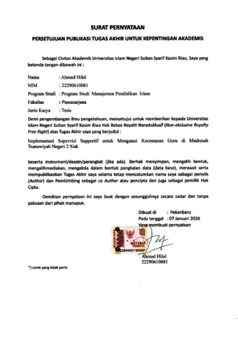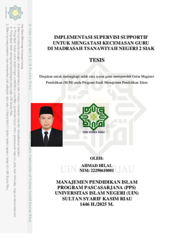 "ABSTRAK Ahmad Hilal (2025) : Implementasi Supervisi Supportif untuk Mengatasi Kecemasan Guru di Madrasah Tsanawiyah Negeri 2 Siak. Penelitian ini bertujuan untuk menganalisis secara kualitatif implementasi supervisi suportif oleh kepala madrasah sebagai upaya mengatasi kecemasan guru di Madrasah Tsanawiyah Negeri 2 Siak. Secara spesifik, penelitian ini bertujuan untuk menganalisis langkah-langkah implementasi supervisi suportif yang dilakukan kepala madrasah sebagai Upaya mengatasi kecemasan guru dan mengidentifikasi faktor pendukung dan penghambat implementasi supervisi suportif tersebut. Jenis penelitian ini adalah penelitian lapangan dengan pendekatan kualitatif yang menggunakan instrument wawancara dan dokumentasi sebagai teknik pengumpulan data, serta model Miles dan Huberman sebagai Teknik Analisa data. Penelitian ini dilakukan di Madrasah Tsanawiyah Negeri 2 Siak dimulai dari bulan Agustus sampai dengan bulan November 2025. Hasil penelitian menunjukkan bahwa supervisi suportif dilakukan oleh kepala madrasah melalui langkah-langkah terstruktur dan kolaboratif, meliputi: Perencanaan, pelaksanaan, evaluasi dan analisi hasil supervisi, rencana tindak lanjut, dan laporan pelaksanaan supervisi. Adapun faktor pendukung implementasi supervisi supportif di Madrasah Tsanawiyah Negeri 2 Siak adalah dukungan emosional, dukungaan instrumental, dukungan penghargaan, dukungan informasi, dukungan integrasi sosial, dan dukungan spiritual. Sedangkan faktor penghambat adalah kurangnya Semangat keilmuan guru, lemahnya kreatifitas dan kurangnya fasilitas. Supervisi suportif di Madrasah Tsanawiyah Negeri 2 Siak menjadi strategi manajerial yang efektif dalam mengatasi kecemasan guru melalui pendekatan yang humanis dan dukungan yang komprehensif. Implementasi yang fokus pada pembinaan, kolaborasi, dan dukungan emosional/sosial terbukti menjadi kunci untuk meningkatkan ketahanan guru dan berdampak positif pada kualitas pengajaran. Kata Kunci : Implementasi, Supervisi Suportif, Kecemasan Guru"