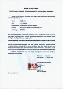 ROSLAYNI, - (2026) FOREIGN LANGUAGE ENJOYMENT AMONG JUNIOR HIGH SCHOOL STUDENTS AT MTS AL-FAJAR. Skripsi thesis, UNIVERSITAS ISLAM NEGERI SULTAN SYARIF KASIM RIAU.