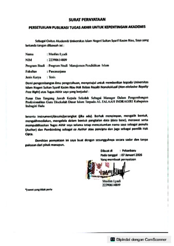 ABSTRAK Muslim Lyadi (2025) : “Peran dan Tanggung Jawab Kepala Sekolah Sebagai Manager (Pengelola) Dalam Pengembangan Profesionalitas Guru di Sekolah Dasar Islam Terpadu Al Falaah Rengat Kabupaten Indragiri Hulu” Penelitian ini untuk menganalisis masalah di lapangan yang peneliti temukan seperti belum meratanya tingkat profesionalitas guru, keterbatasan pelatihan berkelanjutan, serta kendala waktu dan sarana dalam pengembangan profesionalitas guru di sekolah dasar Islam terpadu Al Falaah Rengat Kabupaten Indragiri Hulu dengan menganalisis manajemen kepemimpinan kepala sekolah dan melihat faktor pendukung serta penghambat kepala sekolah dalam mengembangkan profesionalitas guru. Jenis penelitian adalah penelitian lapangan dengan metode penelitian kualitatif. Teknik pengumpulan data melalui observasi, wawancara dan studi pustaka yang kemudian dianalisis lalu ditarik kesimpulan. Sedangkan untuk lokasi penelitian ini di jalan Narasinga Ujung, Kelurahan Kampung Dagang, Kecamatan Rengat, Kabupaten Indragiri Hulu, Riau. Berdasarkan hasil penelitian menunjukkan bahwa penerapan manajemen kepala sekolah dalam pengembangan profesionalitas guru di sekolah dasar Islam terpadu Al Falaah Rengat meliputi fungsi perencanaan (planning), fungsi pengorganisasian (organizing), fungsi pengarahan (actuating), dan fungsi pengawasan (controlling) sebagai dasar dalam menyusun manajemen. Penerapan fungsi manajemen ini dilakukan agar kepala sekolah SDIT Al Falaah Rengat dapat membuat kebijakan, prosedur, standar & metode pelaksanaan mengajar guru, menetapkan jumlah kuota dalam penerimaan siswa/i baru, mengidentifikasi tantangan, permasalahan, maupun potensi yang ada sebelum menyusun rencana pengembangan sekolah, menetapkan guru dan pegawai pada tujuan sekolah, melakukan partisipasi terhadap keputusan, tindakan dan perbuatan, memberikan pengarahan, pelatihan, motivasi, dan penghargaan terhadap guru, mencukupi keperluan guru sesuai dengan kegiatan pekerjaannya, menerapkan program pemberdayaan musyawarah guru mata pelajaran(MGMP), mewajibkan para guru untuk membaca dan menulis jurnal atau karya ilmiah, dan mewajibkan simposium guru. Untuk faktor pendukung meliputi beberap aspek penting seperti: 1) Komitmen dan kepemimpinan kepala sekolah SDIT Al Falaah Rengat. 2) Dukungan sarana dan prasaran. 3) Program pelatihan dan pengembangan yang terencana. 4) Program pembinaan guru secara profesional, dan 5) Program kenyamanan dan keamanan sekolah. Sedangkan untuk faktor penghambat meliputi: 1) Kurangnya komitmen guru. 2) Waktu yang terbatas. 3) Keterbatasan anggaran, dan 4) Kepemimpinan yang kurang efektif. Kata Kunci: Manajemen, Kepemimpinan, dan Profesionalitas Guru.