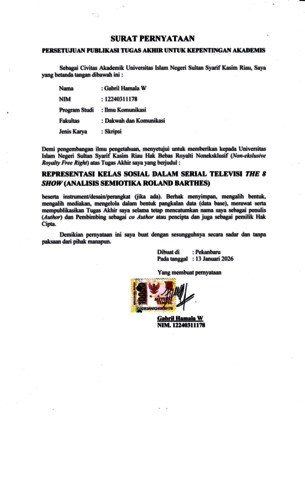 GABRIL HAMALA W, - (2026) REPRESENTASI KELAS SOSIAL DALAM SERIAL TELEVISI THE 8 SHOW (ANALISIS SEMIOTIKA ROLAND BARTHES). Skripsi thesis, UNIVERSITAS ISLAM NEGERI SULTAN SYARIF KASIM RIAU.