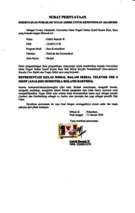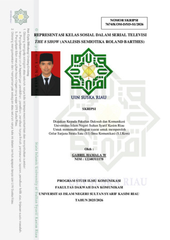 ABSTRAK Nama Jurusan Judul : : : Gabril Hamala W Ilmu Komunikasi Representasi Kelas Sosial dalam Serial Televisi The 8 Show (Analisis Semiotika Roland Barthes) Penelitian ini bertujuan untuk menganalisis representasi kelas sosial dalam serial televisi The 8 Show (2024) melalui pendekatan semiotika Roland Barthes. Serial ini menampilkan delapan individu dengan latar belakang ekonomi yang berbeda yang dipaksa bertahan hidup dalam sebuah sistem permainan dengan aturan ekonomi yang tidak adil, sehingga memunculkan dinamika ketimpangan, dominasi, dan eksploitasi kelas. Metode penelitian yang digunakan adalah kualitatif deskriptif dengan teknik pengumpulan data berupa observasi dan dokumentasi terhadap adegan-adegan terpilih dalam serial The 8 Show. Analisis data dilakukan dengan mengkaji makna denotasi, konotasi, dan mitos pada simbol visual, dialog, serta struktur naratif yang merepresentasikan kelas sosial. Hasil penelitian menunjukkan bahwa The 8 Show merepresentasikan ketimpangan kelas sosial melalui simbol struktur gedung bertingkat, perbedaan akses terhadap sumber daya, sistem ekonomi internal yang eksploitatif, serta relasi kuasa antara peserta. Kelas atas digambarkan memiliki kontrol, dominasi, dan kebebasan yang lebih besar, sementara kelas bawah mengalami penindasan, dehumanisasi, dan ketidakadilan struktural. Pada tingkat mitos, serial ini membangun kritik terhadap sistem kapitalisme ekstrem yang menormalisasi eksploitasi manusia, fetisisme kekuasaan, dan ilusi kesejahteraan. Penelitian ini menyimpulkan bahwa The 8 Show tidak hanya berfungsi sebagai hiburan, tetapi juga sebagai teks budaya yang merefleksikan dan mengkritik realitas ketimpangan sosial dalam masyarakat kapitalis modern. Kata kunci: representasi, kelas sosial, semiotika Roland Barthes, The 8 Show, kritik sosial.