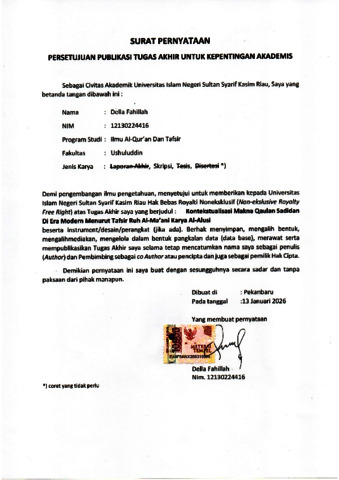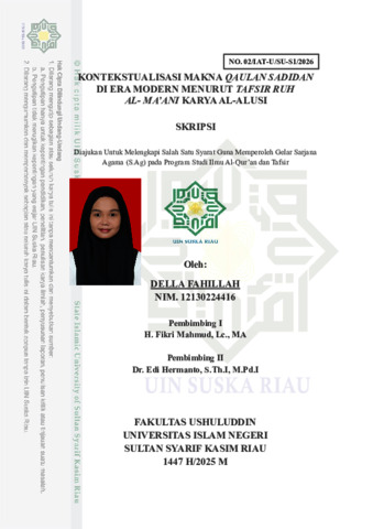 DELLA FAHILLAH, - (2026) KONTEKSTUALISASI MAKNA QAULAN SADIDAN DI ERA MODERN MENURUT TAFSIR RUH AL- MA’ANI KARYA AL-ALUSI. Skripsi thesis, UNIVERSITAS ISLAM NEGERI SULTAN SYARIF KASIM RIAU.