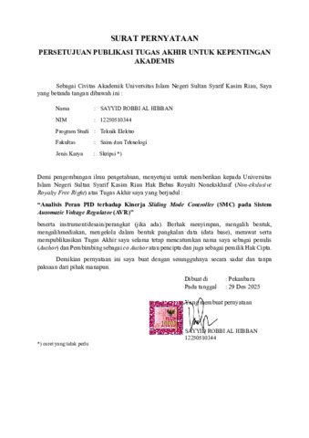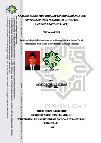 SAYYID ROBBI AL HIBBAN, - (2026) ANALISIS PERAN PID TERHADAP KINERJA SLIDING MODE CONTROLLER (SMC) PADA SISTEM AUTOMATIC VOLTAGE REGULATOR (AVR). Skripsi thesis, UNIVERSITAS ISLAM NEGERI SULTAN SYARIF KASIM RIAU.