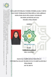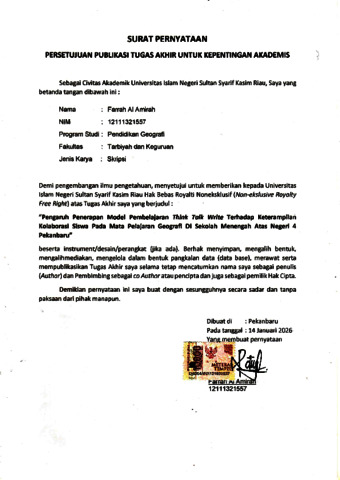 ABSTRAK Farrah Al Amirah, (2025) : Pengaruh Penerapan Model Pembelajaran Think Talk Write terhadap Keterampilan Kolaborasi Siswa pada Mata Pelajaran Geografi di SMA Negeri 4 Pekanbaru Penelitian ini bertujuan untuk mengetahui Pengaruh penerapan Model Pembelajarann Think Talk Write terhadap Keterampilan Kolaborasi Siswa pada Mata Pelajaran Geografi. Penelitian ini menggunakan pendekatan Kuantitatif dengan metode Quasi Eksperimen dengan desain Nonequivalen Control Group Design. Populasi dalam penelitian ini adalah siswa kelas X yang terdiri dari 12 kelas. Teknik pengambilan sampel menggunakan Puroposive Sampling, dengan kelas X.7 sebagai kelas Kontrol dengan memberikan perlakuan model pembelajaran Konvensional dan kelas X.5 sebagai kelas Eksperimen dengan memberikan perlakuan model pembelajaran Think Talk Write. Pengumpulan data dilakukan dengan Pretest dan Posttest untuk melihat Keterampilan Kolaborasi Siswa, dilengkapi dengan Observasi dan dokumentasi. Analisis data pada penelitian ini menggunakan Statistik Parametrik dengan uji T- Test. Hasil penelitian ini menunjukkan bahwa penerapan model pembelajan Think Talk Write berpengaruh terhadap keterampilan Kolaborasi Siswa pada mata pelajaran Geografi materi Penginderaan Jauh. Hasil uji Independent Sampel T-test yang dilakukan diperoleh diketahui nilai t-hitung sebesar 7.817 dengan derajat kebebasan (df) = 89 didapatkan hasil t-tabel sebesar 1,662. Karena t-hitung (7.817) > t- tabel (1,662) dan nilai signifikansi p-value (0,000) < 0,05 maka H0 ditolak dan Ha diterima. Berdasarkan penjelasan di atas dapat diketahui bahwa terdapat pengaruh model pembelajaran Think Talk Write terhadap keterampilan Kolaborasi siswa pada mata pelajaran geografi di SMAN 4 Pekanbaru. Kata Kunci : Model Pembelajaran Think Talk Write, Keterampilan Kolaborasi Siswa