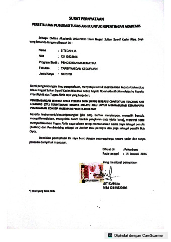 SITI DAHLIA, - (2026) PENGEMBANGAN LEMBAR KERJA PESERTA DIDIK (LKPD) BERBASIS CONTEXTUAL TEACHING AND LEARNING (CTL) TERINTEGRASI BUDAYA MELAYU RIAU UNTUK MEMFASILITASI KEMAMPUAN PEMAHAMAN KONSEP MATEMATIS PESERTA DIDIK SMP. Skripsi thesis, UNIVERSITAS ISLAM NEGERI SULTAN SYARIF KASIM RIAU.