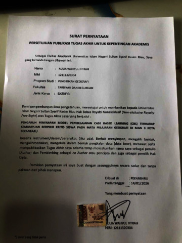 AULIA WAHYUL FITRAH, - (2026) PENGARUH PENERAPAN MODEL PEMBELAJARAN CASE BASED LEARNING (CBL) TERHADAP KEMAMPUAN BERPIKIR KRITIS SISWA PADA MATA PELAJARAN GEOGRAFI DI MAN 3 KOTA PEKANBARU. Skripsi thesis, UNIVERSITAS ISLAM NEGERI SULTAN SYARIF KASIM RIAU.