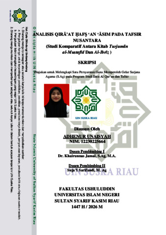 ADHENUR UNAISYAH, - (2025) ANALISIS QIRĀ’AT ḤAFṢ ‘AN ‘ĀSIM PADA TAFSIR NUSANTARA (Studi Komparatif Antara Kitab Turjumān al-Mustafīd Dan Al-Ibrīz ). Skripsi thesis, Universitas Islam Negeri Sultan Syarif Kasim Riau.