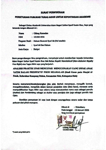 GILANG RAMADAN (2026) " ANALISIS PRAKTIK UPAH MENGUPAH MENGGUNAKAN UANG INFAK ANAK YATIM DALAM PRESPEKTIF FIKIH MUAMALAH (Studi Kasus pada Masjid Al Fatah, Kelurahan Kampung Dalam, Kecamatan Siak, Kabupaten Siak) ". Skripsi thesis, UNIVERSITAS ISLAM NEGERI SULTAN SYARIF KASIM RIAU.