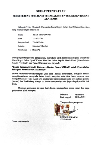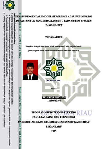 RISKY KURNIAWAN (2026) DESAIN PENGENDALI MODEL REFERENCE ADAPTIVE CONTROL (MRAC) UNTUK PENGENDALIAN SUHU PADA SISTEM STIRRER TANK HEATER. Skripsi thesis, Universitas Islam Negeri Sultan Syarif Kasim.