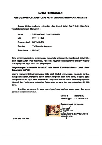 MUHAMMAD DAVID RIDHO, - (2026) PENGEMBANGAN MULTIMEDIA INTERAKTIF PADA MATERI KLASIFIKASI HEWAN UNTUK SISWA TUNARUNGU SMPLB. Skripsi thesis, UNIVERSITAS ISLAM NEGERI SULTAN SYARIF KASIM RIAU.